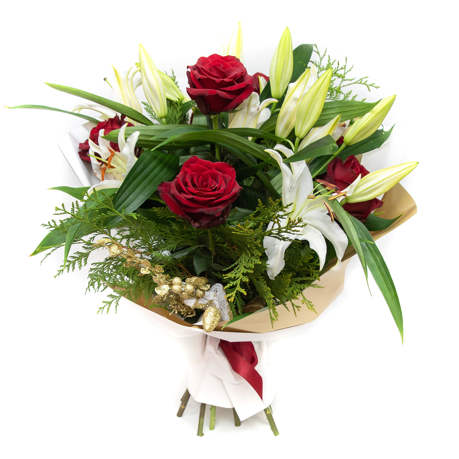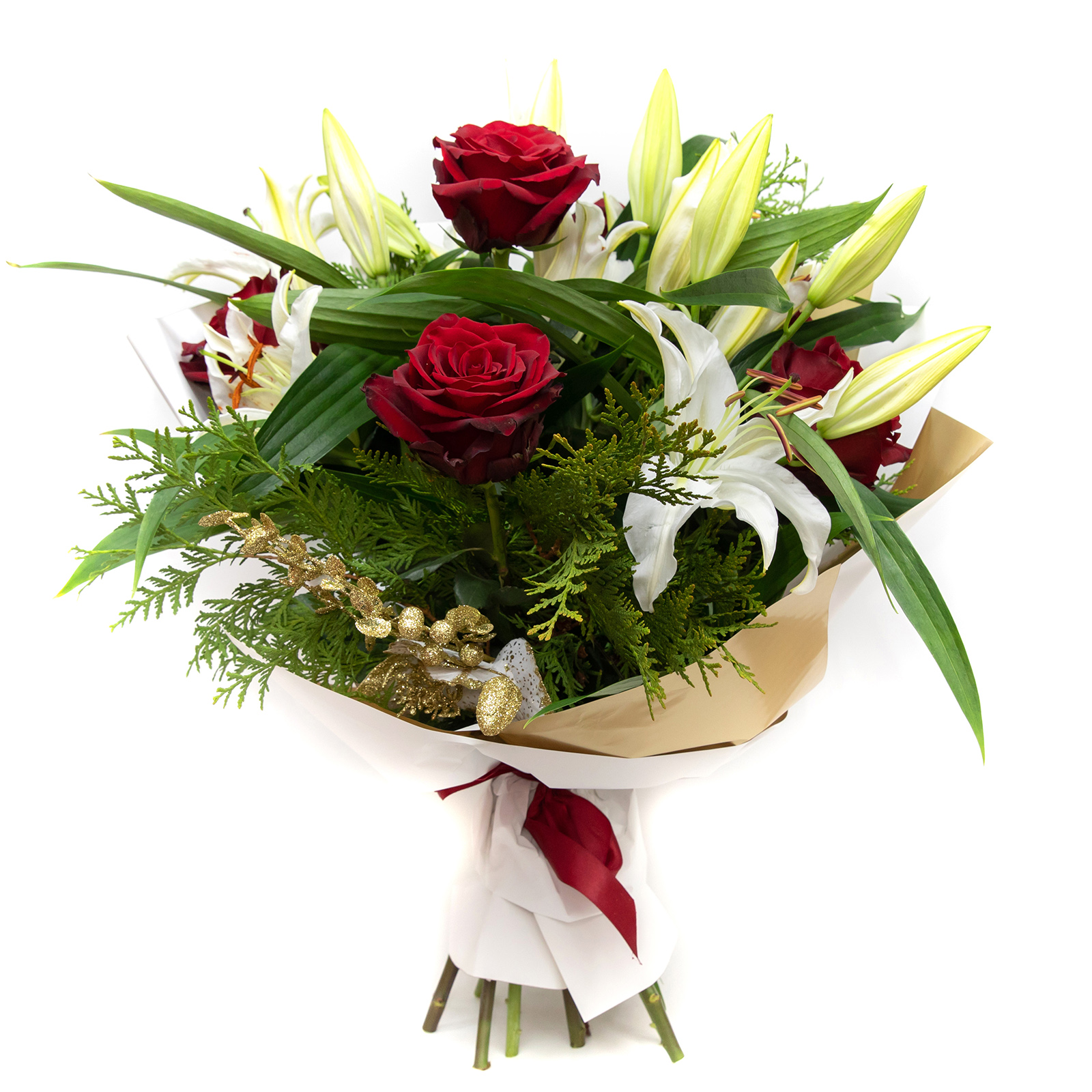 Buchet spectaculos cu tematică festivă, realizat din trandafiri roșii catifelați, crini albi parfumați (deschiși și boboci), verdețuri decorative de sezon (brad, tuia) și accente strălucitoare aurii, completat cu ambalaj elegant în tonuri festive și fundă asortată. Compoziția redă perfect spiritul sărbătorilor de iarnă – eleganță, rafinament și căldură – fiind ideală pentru a oferi un cadou cu adevărat memorabil.