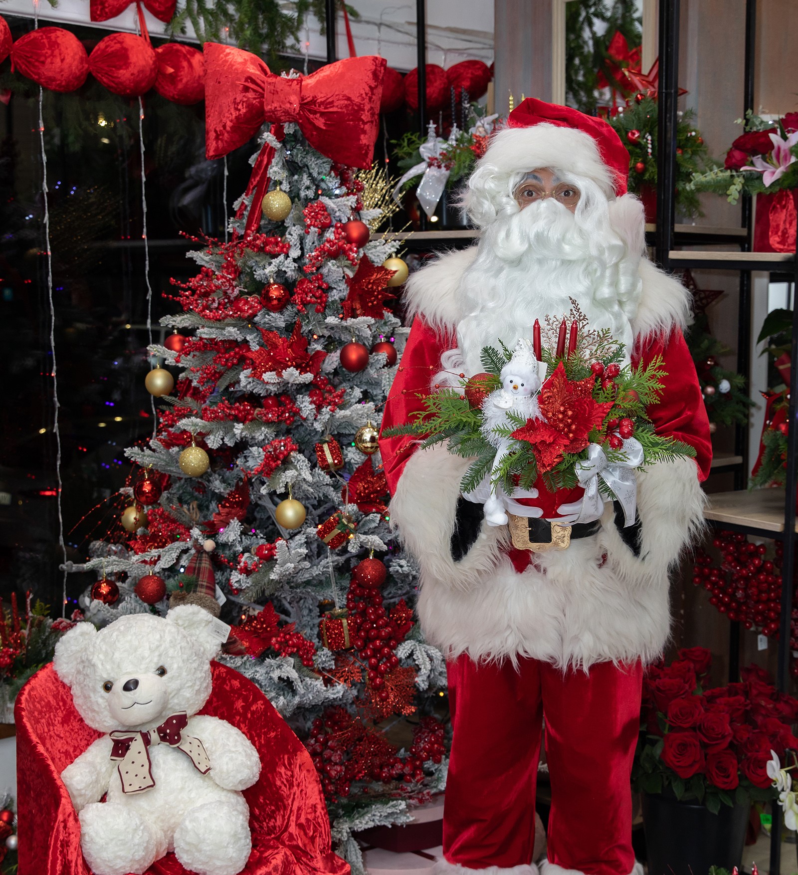 Aranjament realizat din ramuri de brad și tuia, bobițe decorative roșii, globuri festive, floare textilă roșie tip poinsettia, elemente cu mărgele decorative, fundă albă delicată și un personaj decorativ cu aspect de om de zăpadă, completat de trei lumânări roșii așezate central, într-un vas catifelat roșu.