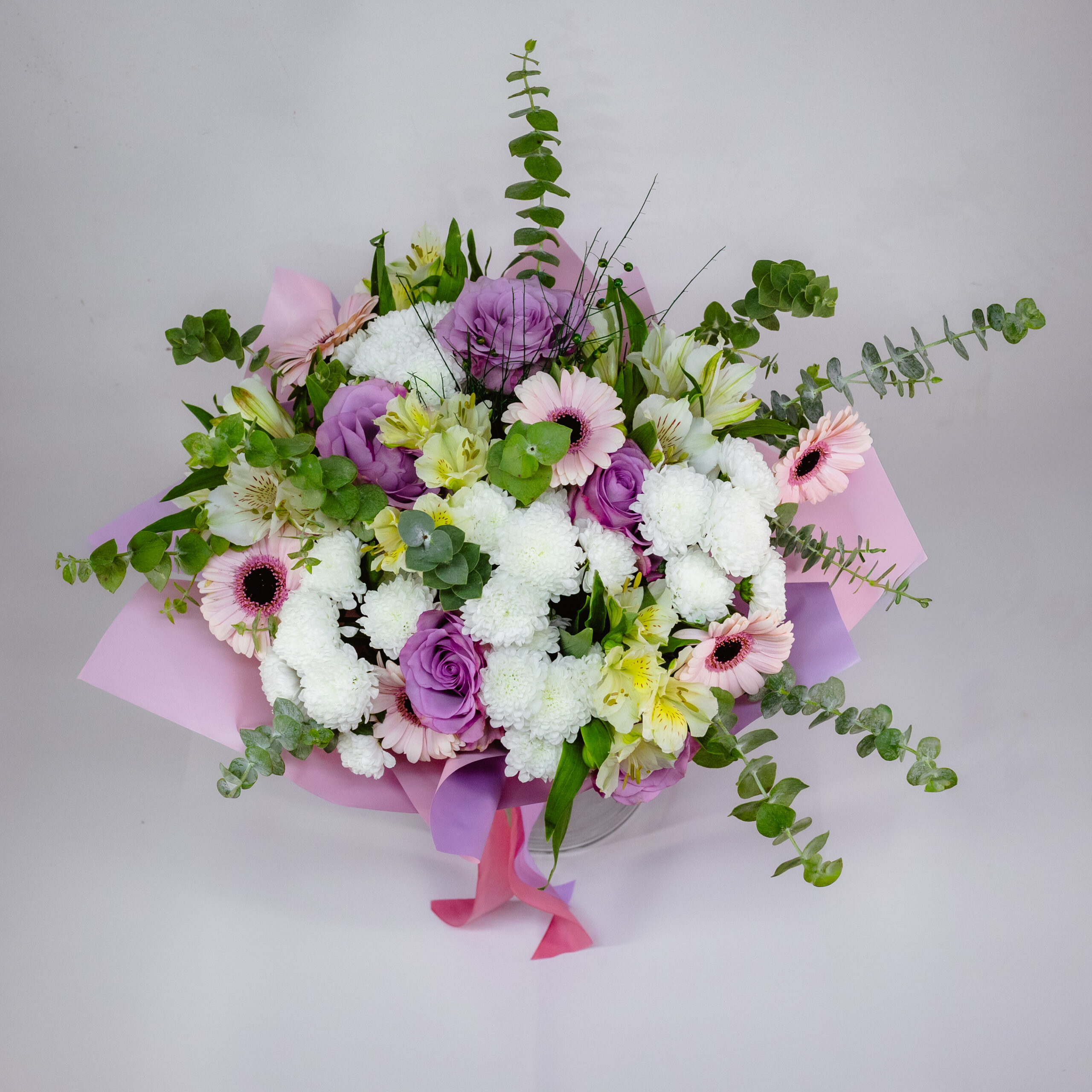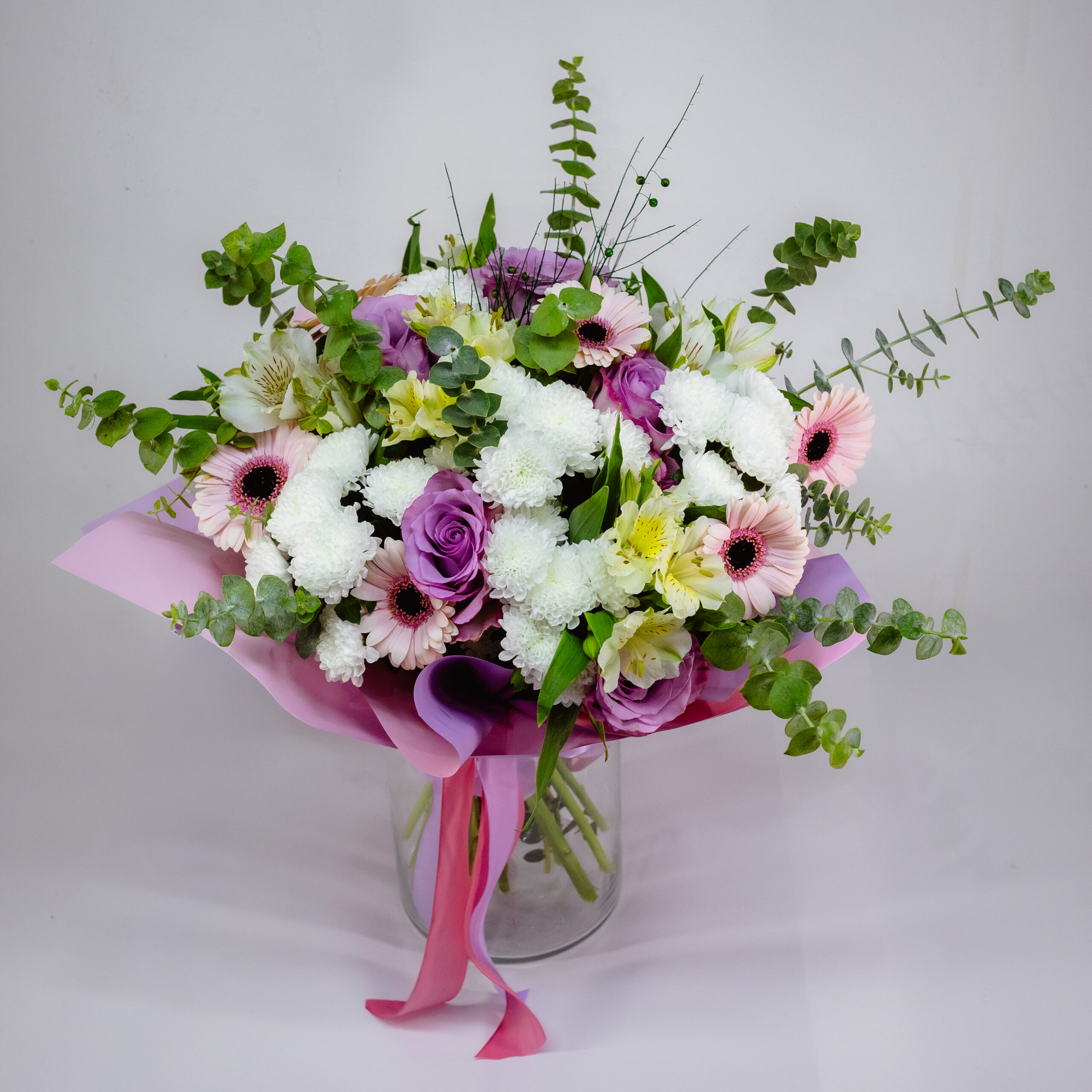 În acest buchet culorile se completează frumos, ai tonuri mov delicate, alb curat și accente verzi proaspete. Gerbera deschid buchetul, iar trandafirii mov îi dau un aer rafinat. Este o alegere potrivită dacă vrei un cadou luminos și calm, cu un echilibru plăcut între energie și finețe.