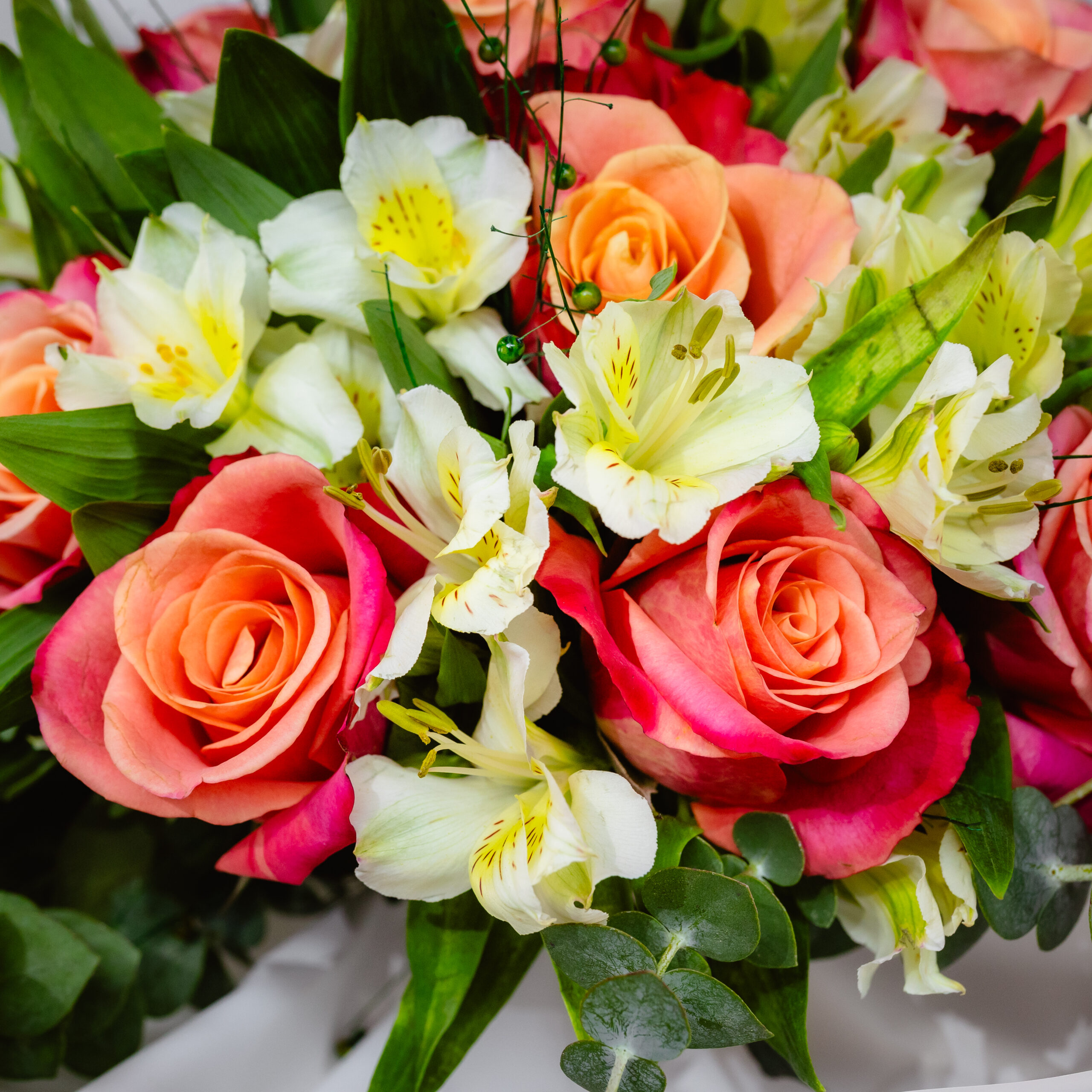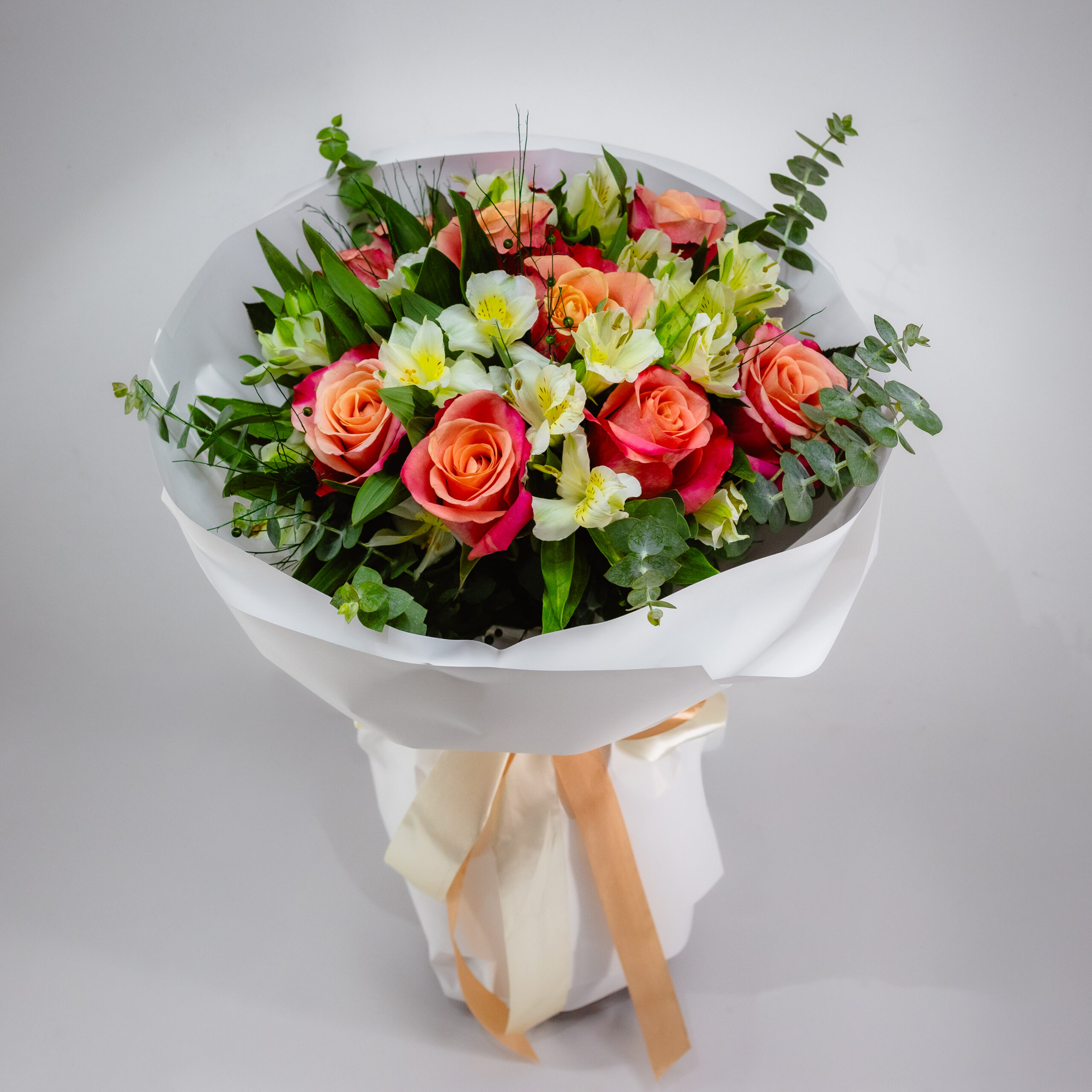 Buchetul acesta îți aduce o vibrație caldă și plăcută. Trandafirii în nuanțe de piersică se combină natural cu alstroemeria crem și cu verdele proaspăt, iar rezultatul este un aranjament rafinat și armonios. Texturile se îmbină frumos, cromatica este blândă, iar structura buchetului transmite eleganță discretă și grijă pentru detalii. Este o alegere potrivită dacă vrei ceva delicat, luminos și cu bun gust.