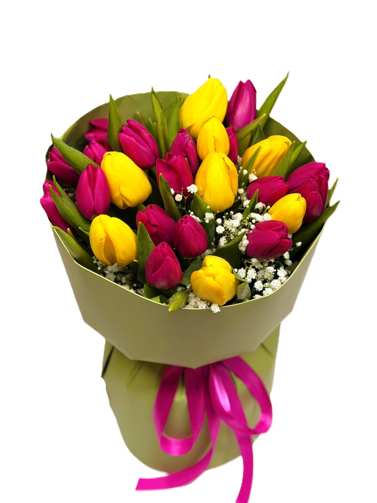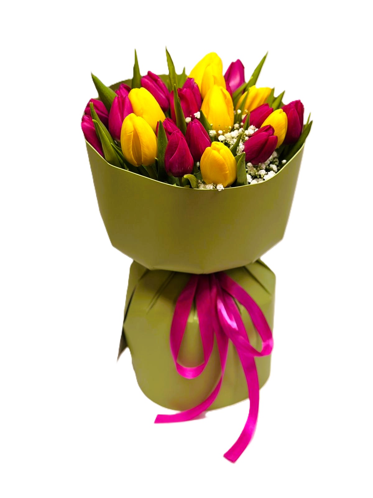 Un buchet proaspăt și plin de vitalitate, ce surprinde perfect frumusețea primăverii prin lalele colorate în nuanțe vibrante de galben și fucsia. Buchetul este completat delicat de verdeață proaspătă și accente fine albe, pentru un aspect echilibrat, vesel și modern.