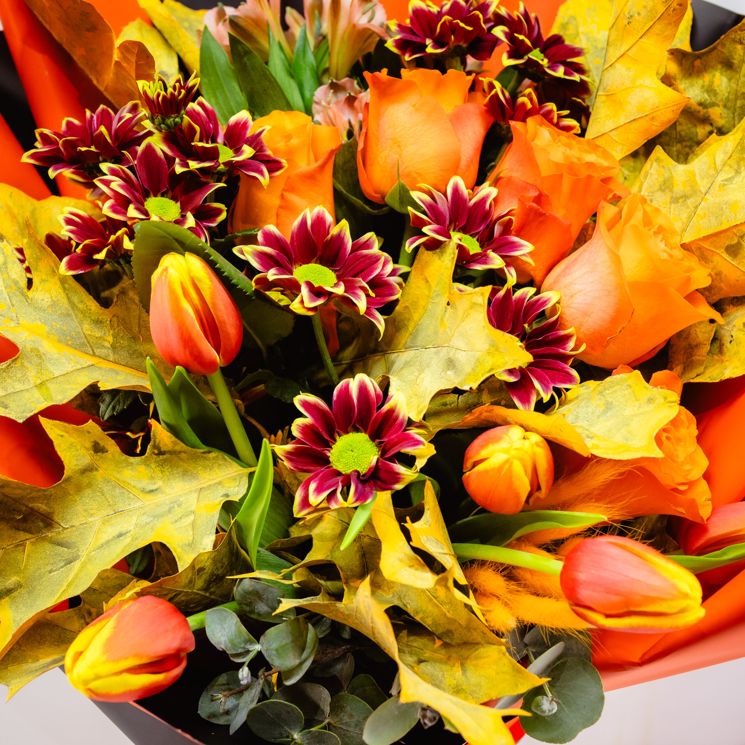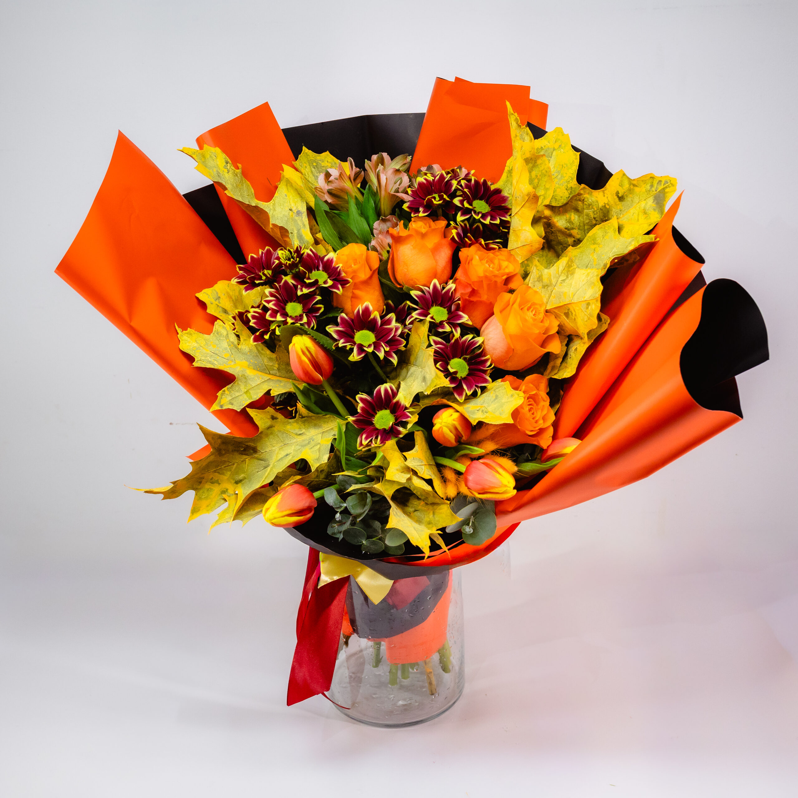 Buchetul măreț îți transmite energie prin nuanțele calde de galben și portocaliu. Ai trandafiri portocalii, gerbera luminoasă și accente de solidago care adaugă vitalitate. Verdele proaspăt echilibrează totul. Este o alegere potrivită când vrei un cadou optimist și plin de căldură.