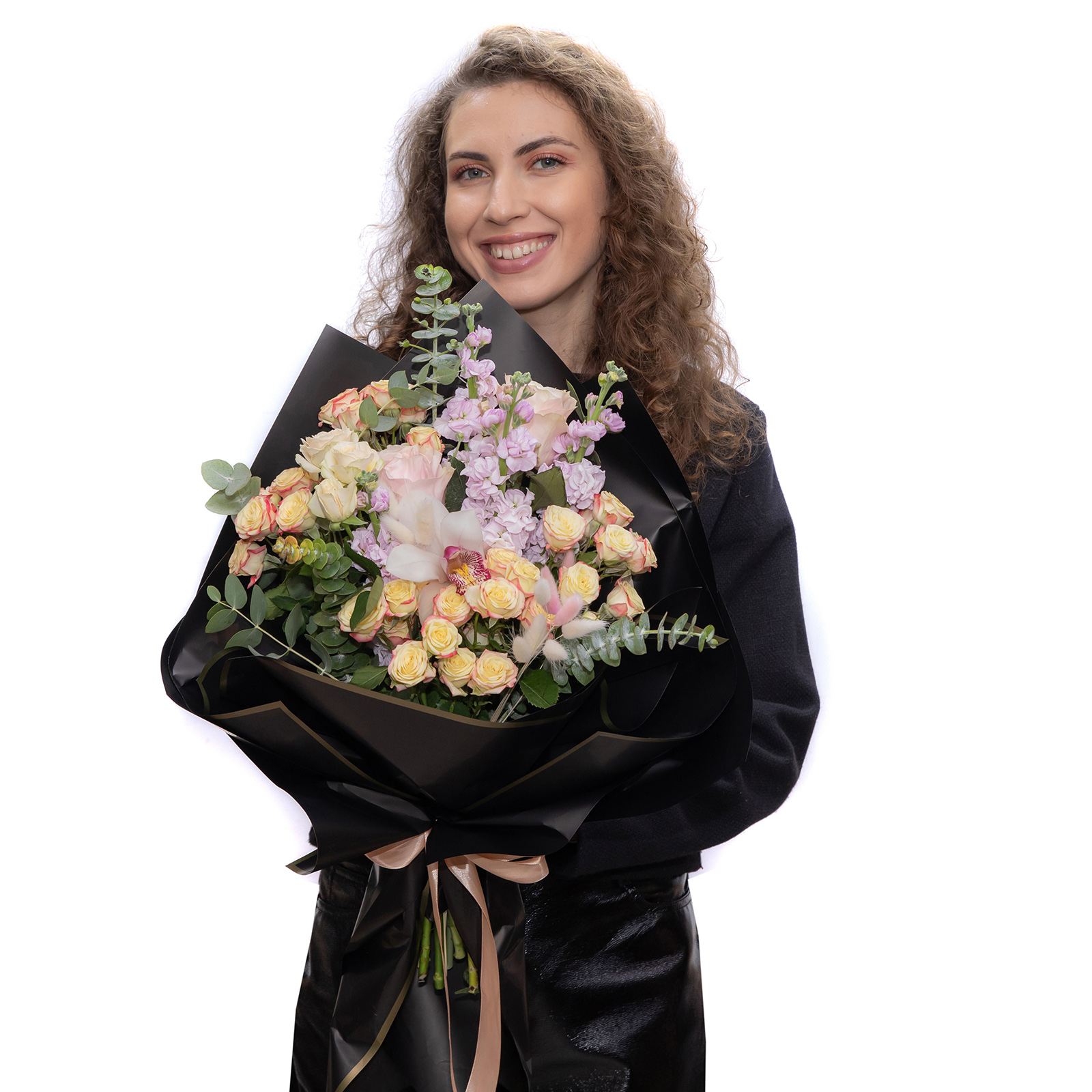 Un buchet cu aer modern, construit din trandafiri crem, lisianthus în nuanțe delicate și accente lila care ies în evidență pe ambalajul negru lucios. Îți oferă un contrast rafinat, cu un stil cochet, perfect pentru cineva care iubește detaliile fine și combinațiile sofisticate.