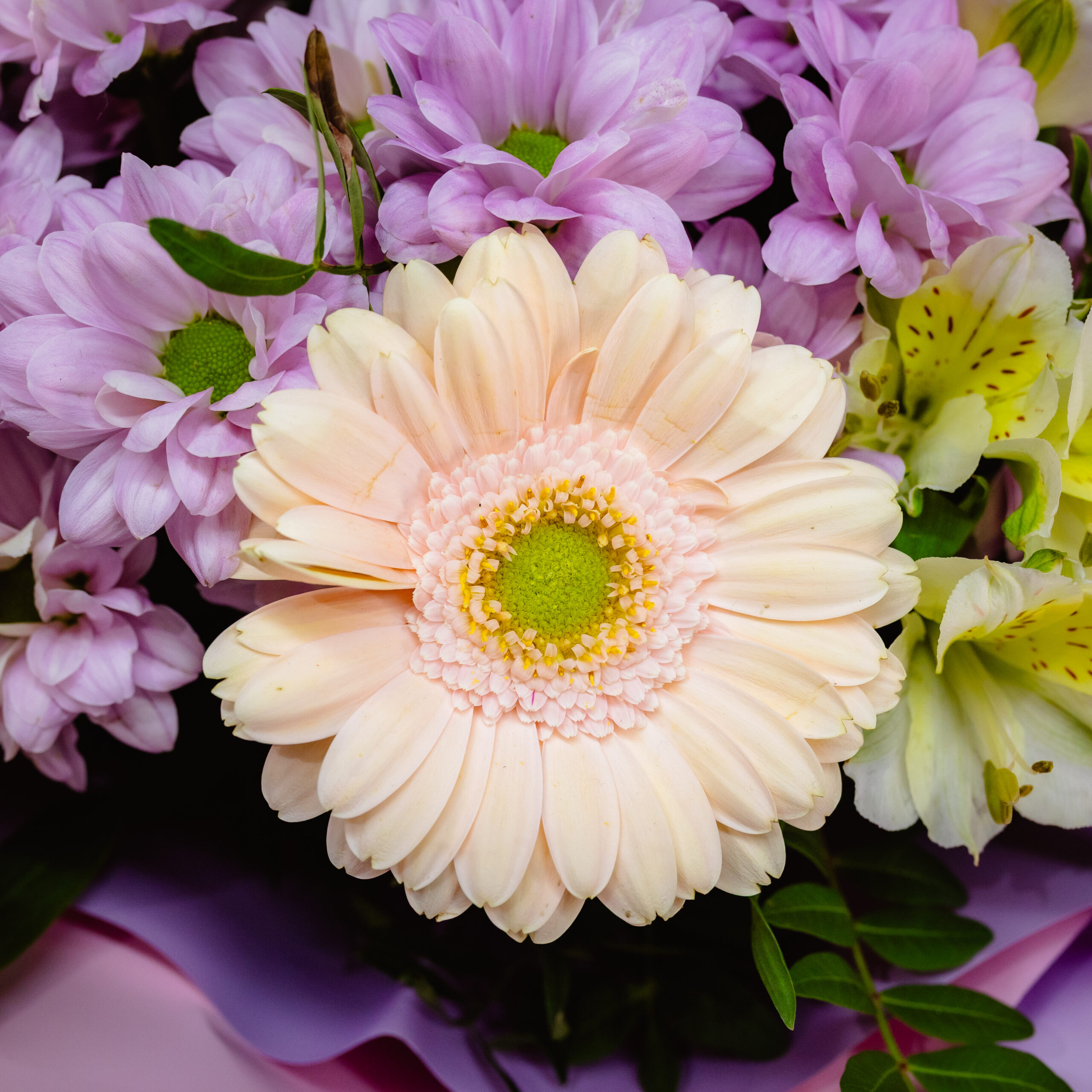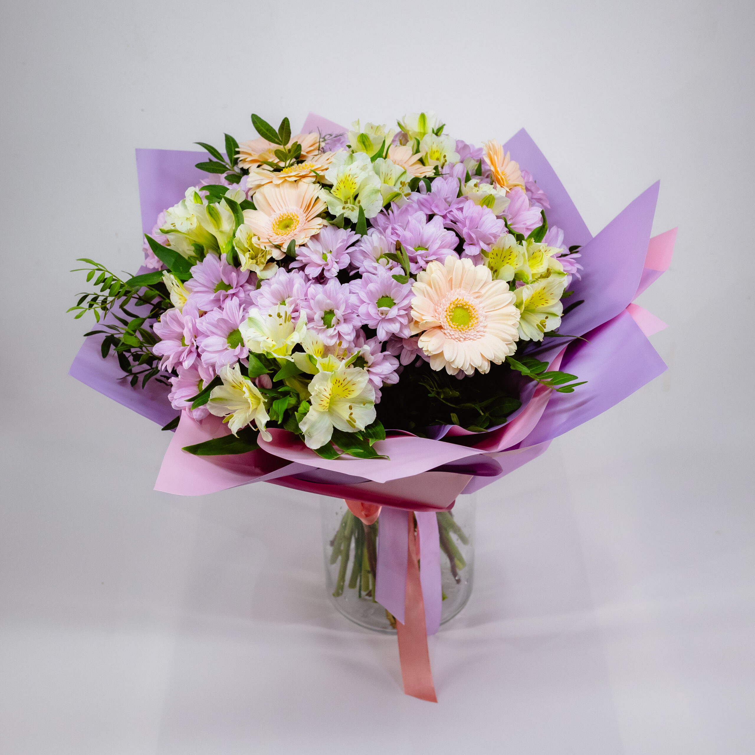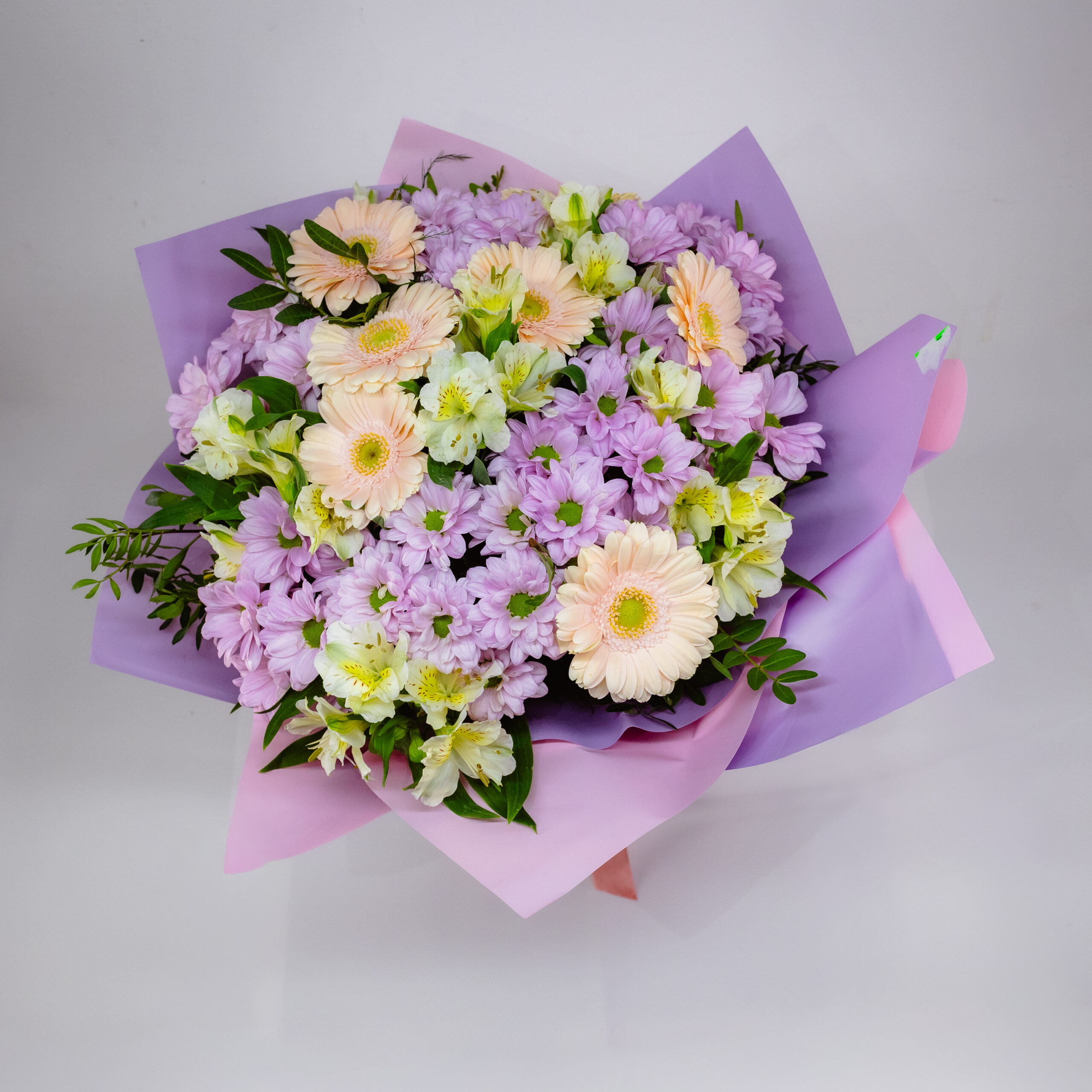 Gerbera crem luminează buchetul, crizantemele lila aduc o tentă calmă, iar alstroemeria oferă finețe. Cromatica pastelată îl face potrivit pentru momente în care vrei un cadou delicat și prietenos, cu un aer modern și curat.