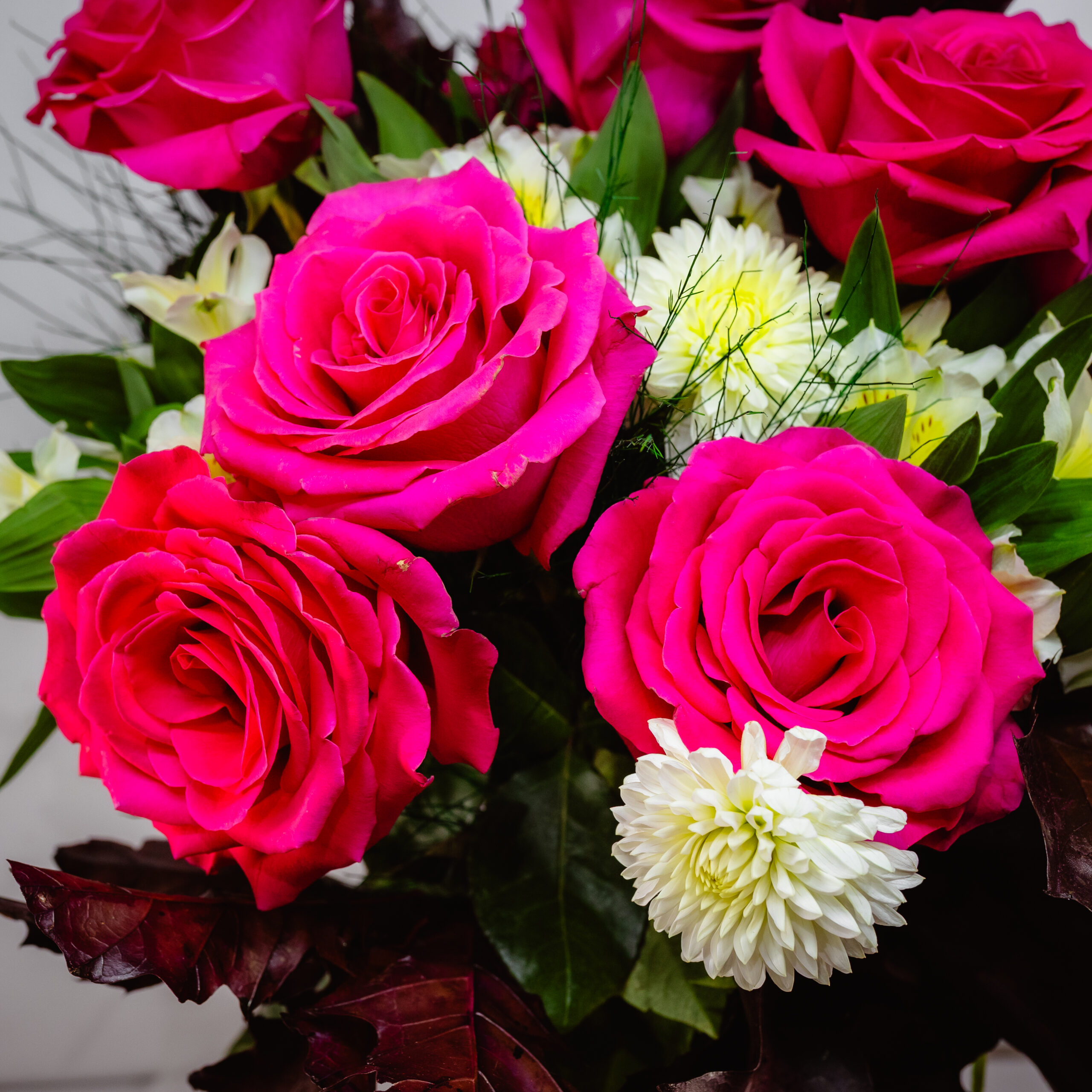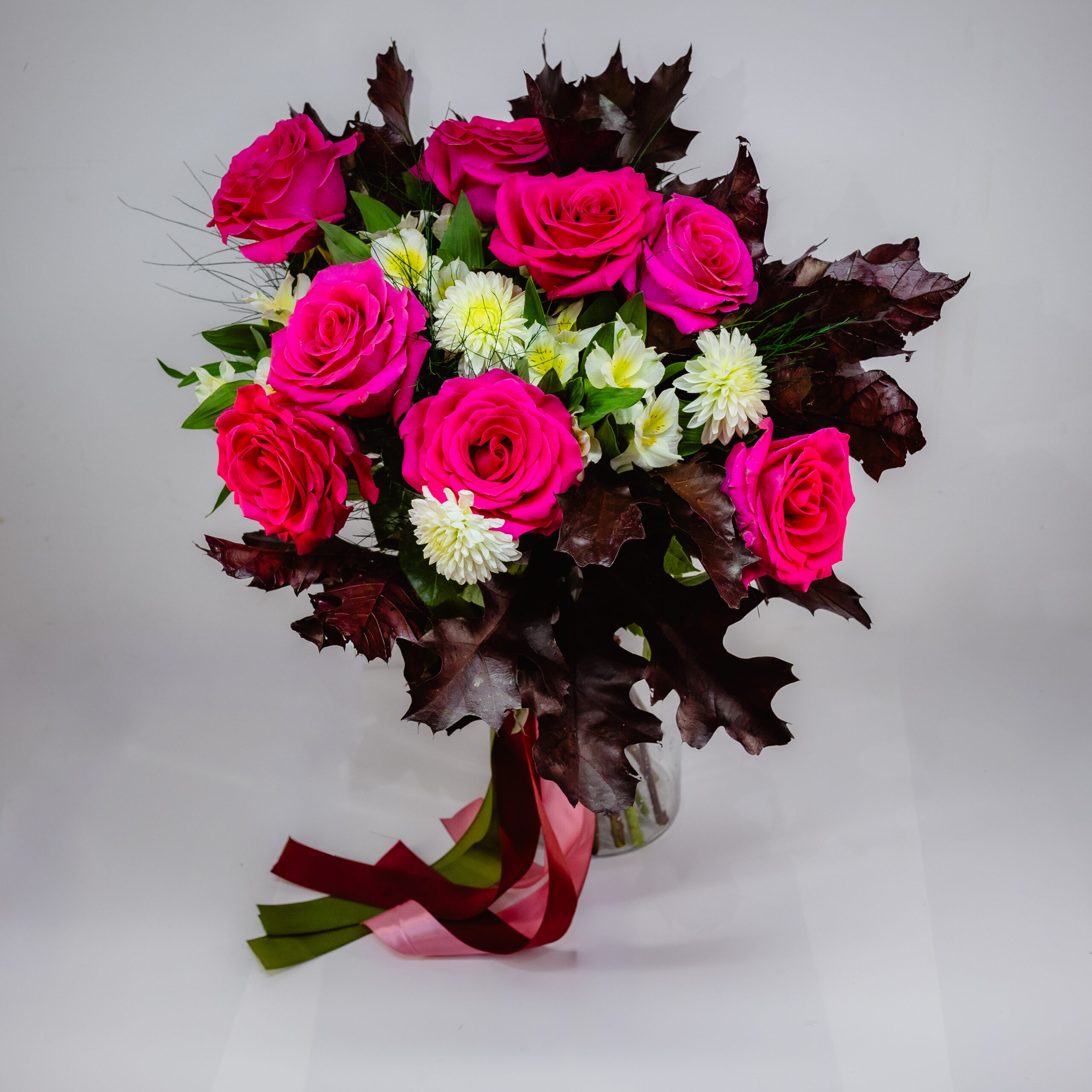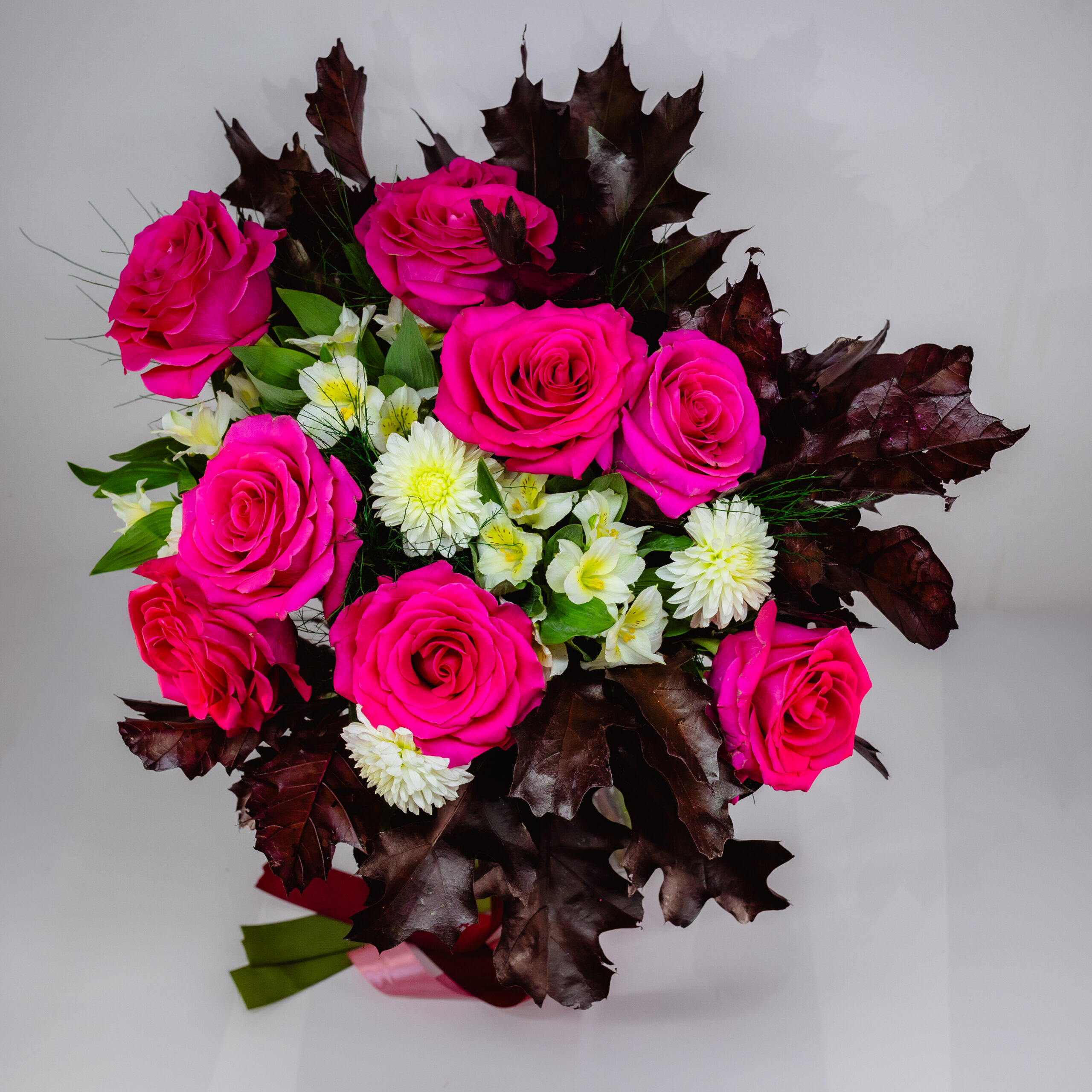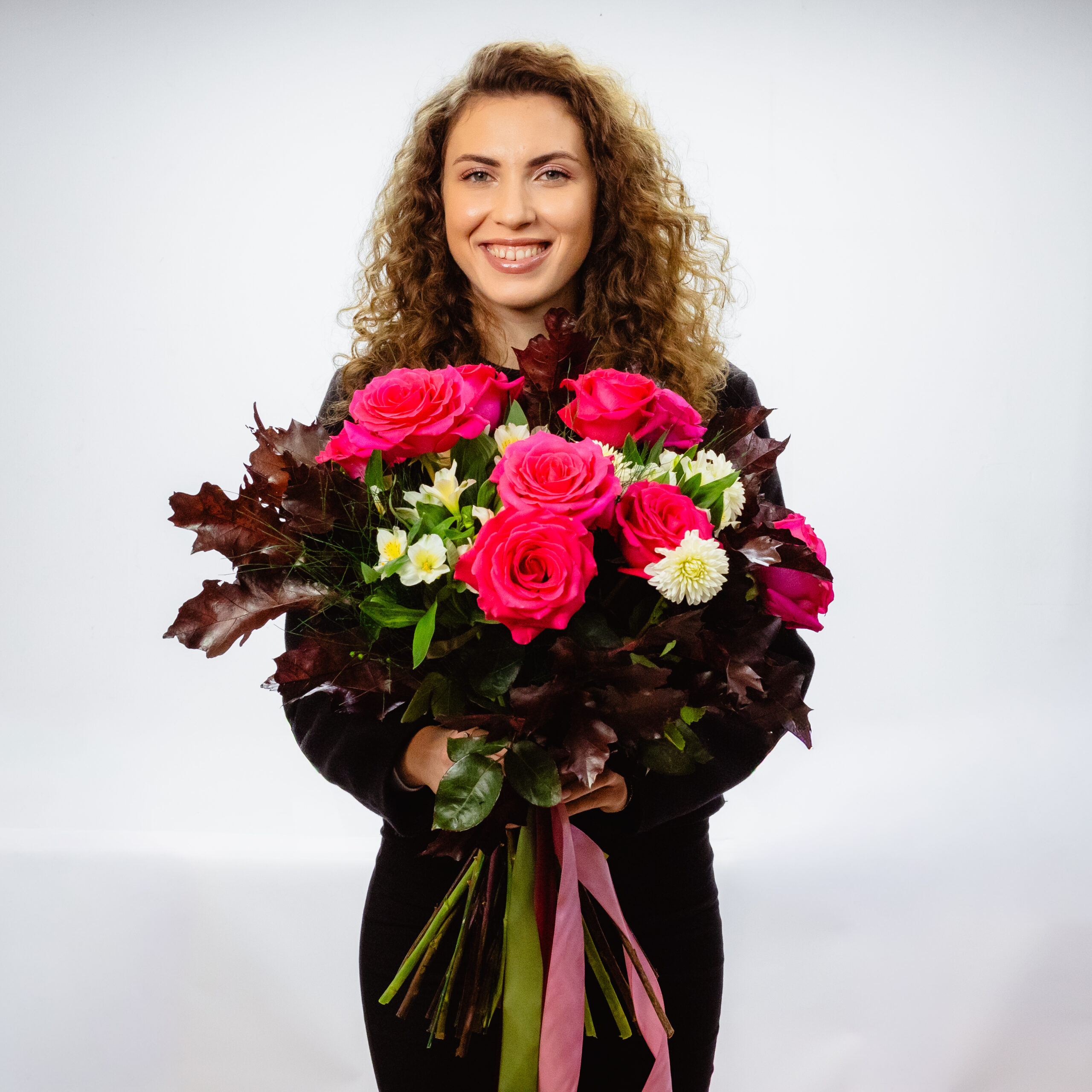 Trandafirii fuchsia atrag privirea imediat, alstroemeria galbenă aduce un plus de luminozitate, iar frunzele burgundy creează un contrast intens. Buchetul este sofisticat și are un aer modern, perfect când vrei ceva puternic și expresiv.