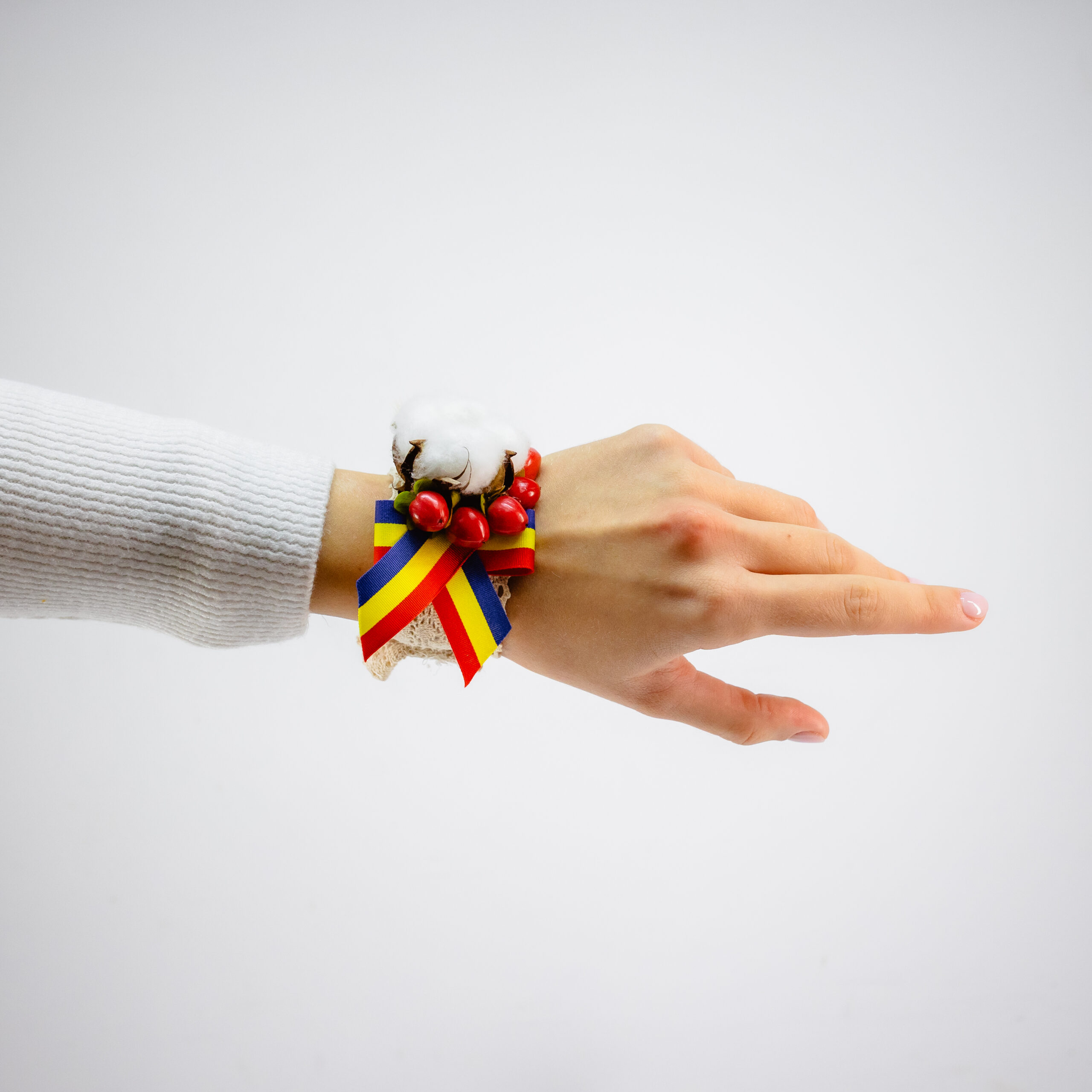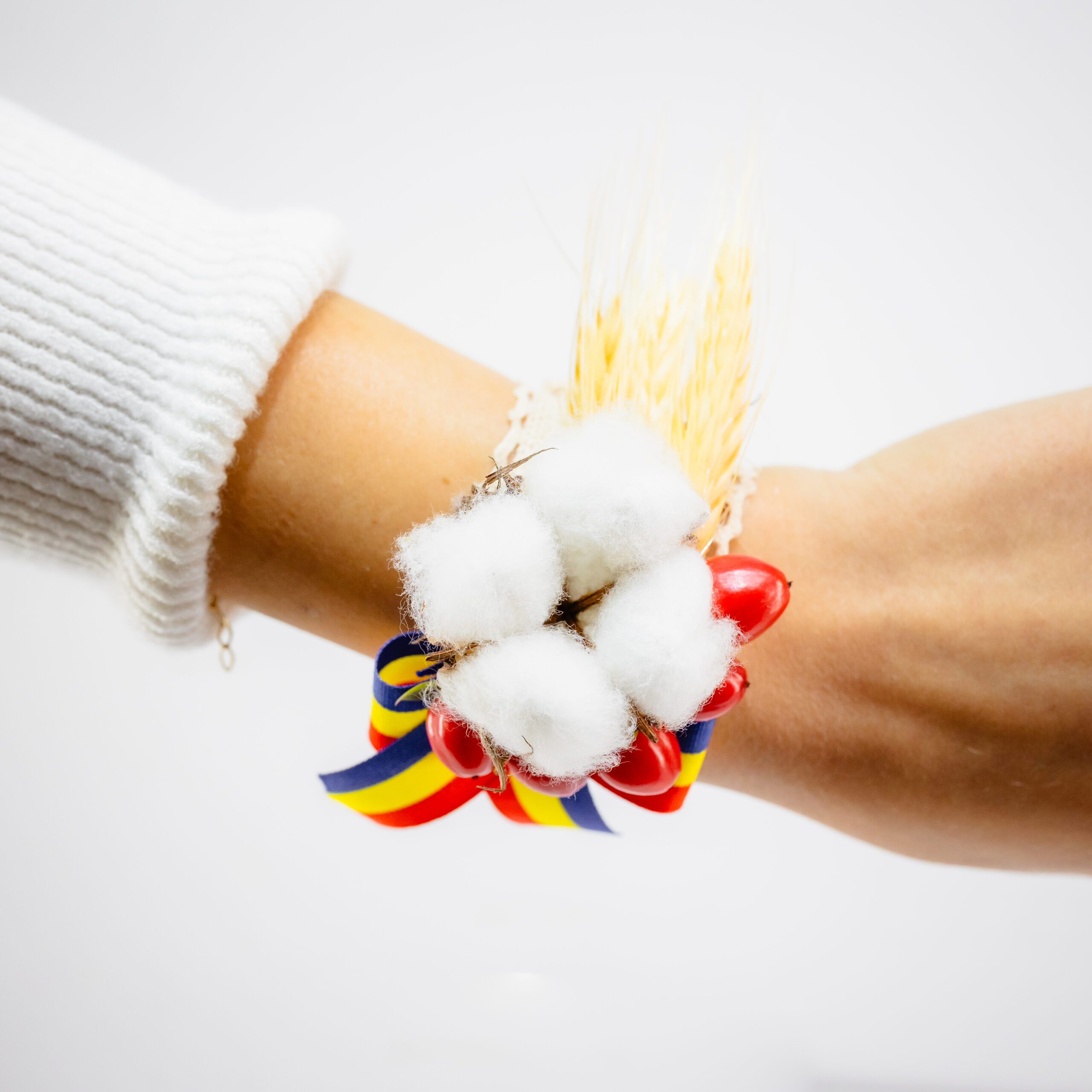 Cocarda are bumbac alb, boabe roșii și panglică tricoloră care dă un aer cald și plin de energie. Este o alegere potrivită dacă vrei un accesoriu simplu, expresiv și cu identitate românească. Se prinde ușor la încheietură și completează frumos buchetul în același stil.