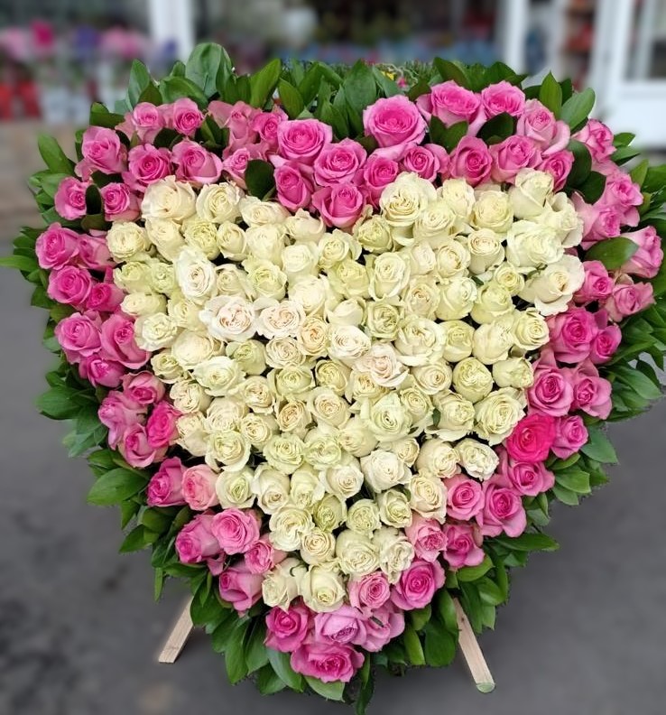 Coroana are un impact puternic prin combinația dintre trandafirii albi și trandafirii roz care conturează forma inimii. Trandafirii albi transmit puritate și respect, iar trandafirii roz aduc delicatețe și căldură. Îți oferă o modalitate elegantă și demnă de a onora o persoană dragă. Ruscusul completează compoziția și pune în valoare fiecare floare.