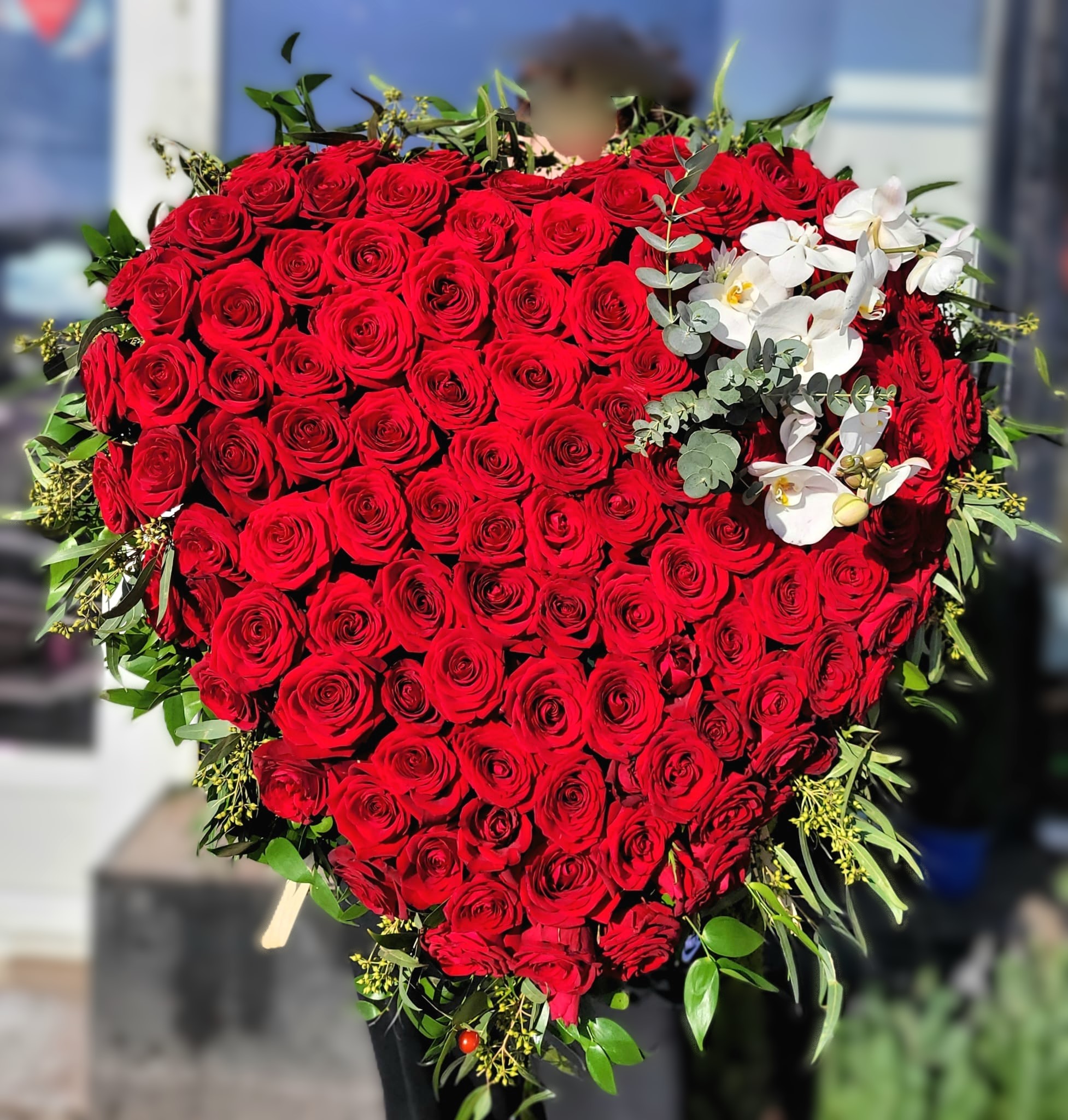 Coroana impresionează prin forma clară de inimă și prin roșul intens al celor 150 de trandafiri. Este spectaculoasă, demnă și elegantă. Trandafirii transmit respect și devotament, iar accentele de orhidee albă aduc un plus de finețe și lumină. Este potrivită când vrei să transmiți un omagiu puternic și special.