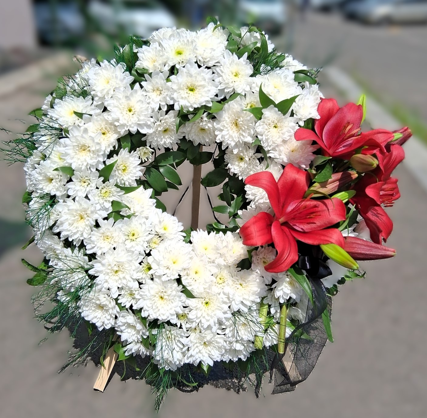 Coroana are un design curat și luminos, construit din crizanteme albe care creează un cerc uniform și elegant. Pe lateral, cele 4 cupe de crin roșu adaugă un accent puternic, plin de expresie. Contrastul dintre alb și roșu transmite respect și noblețe. Este o alegere potrivită când vrei un omagiu simplu, dar demn.