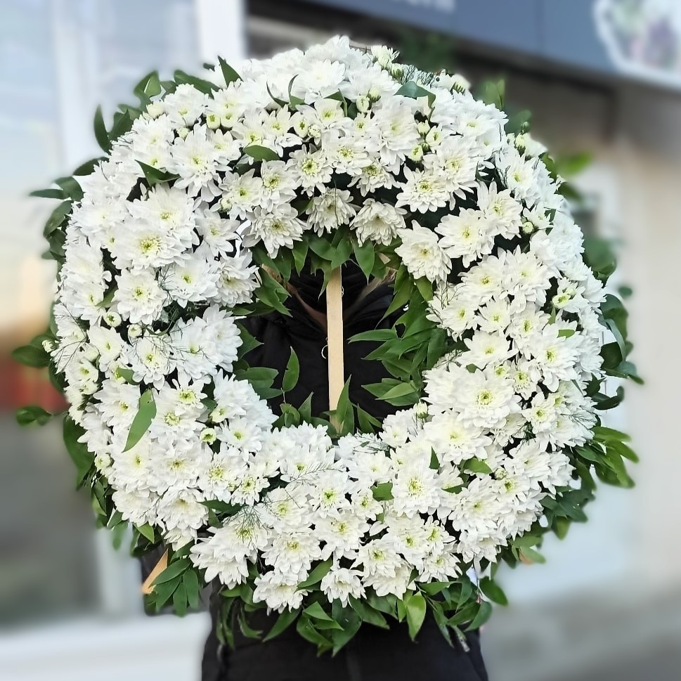 Coroana este realizată doar din crizanteme albe, așezate uniform pentru un efect luminos și curat. Albul transmite respect și liniște, iar forma rotundă dă continuitate și eleganță. Este potrivită pentru un omagiu sobru și demn.