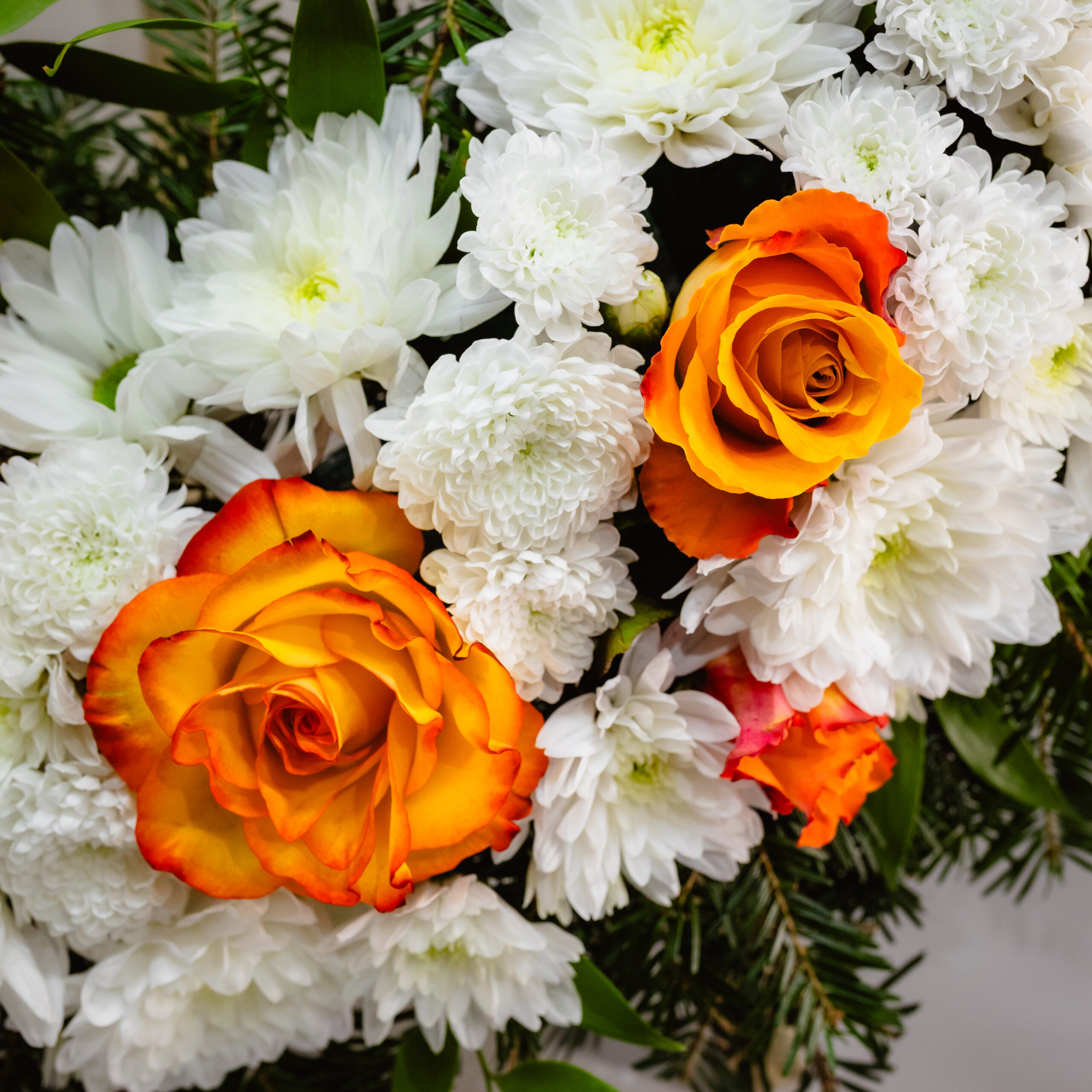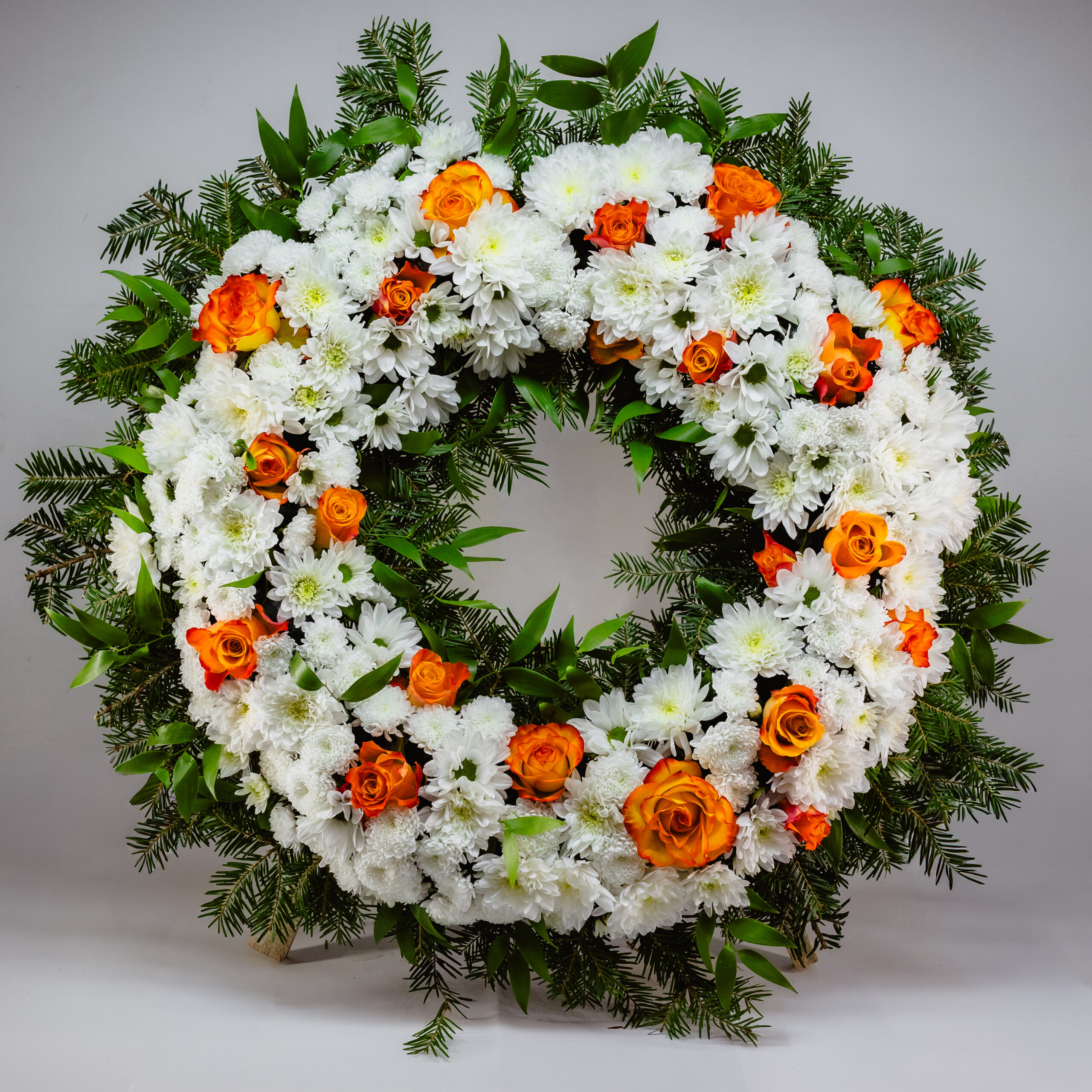 Coroana îmbină trandafirii portocalii cu crizanteme albe pentru un omagiu luminos și curat. Trandafirii adaugă căldură și delicatețe, iar crizantemele oferă echilibru și rafinament. Culoarea și forma sunt puse în valoare de structura rotundă, realizată pe burete umed, care menține florile proaspete mai mult timp. Este o alegere potrivită când vrei să transmiți respect, recunoștință și un mesaj plin de demnitate.